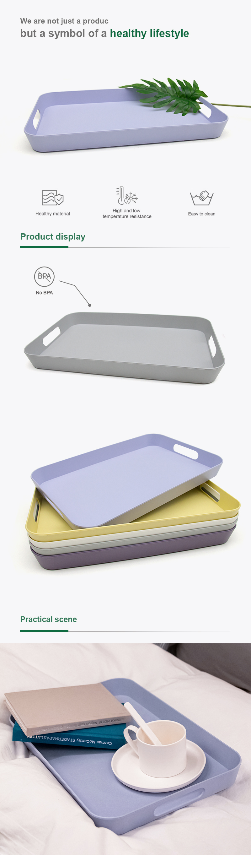 IDEAL DESIGN: The size is manageable large enough room for a salad plate, silverware and tea on it, looking as a modern rectangular style meal tray with hand size fit, it is easy to hand on hook and stackable for storage in your kitchen. It doesn’t stain and easy to clean.