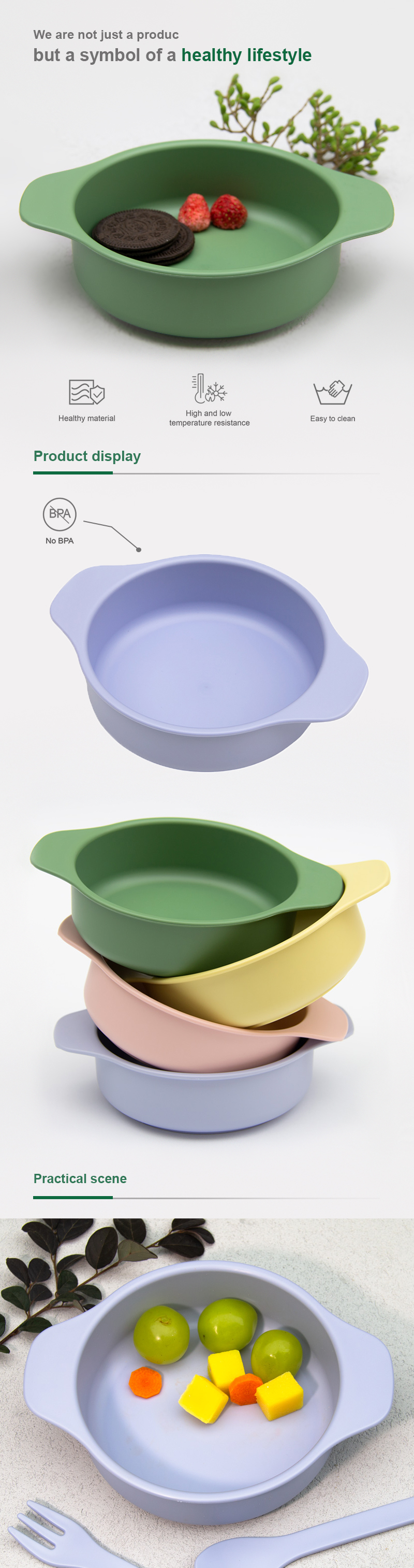 Eco-Friendly: The PLA bowl for kids are made of non-major crops, resulting in over 60% less carbon offset than traditional plastic.They are bio-degradable in composting plants.