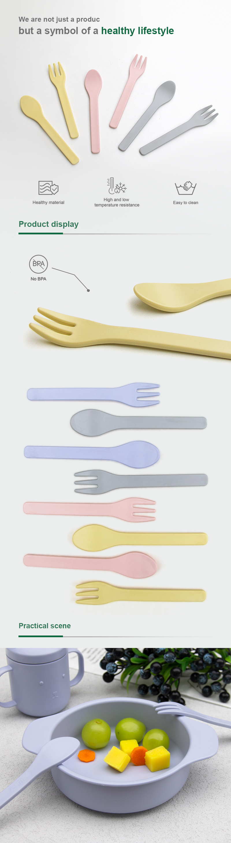 User Notes: The baby forks and spoons withstand -20°C to 100°C (-4°F to 212°F). It is designed for feeding or self-dining children —no microwave or regular oven heating.